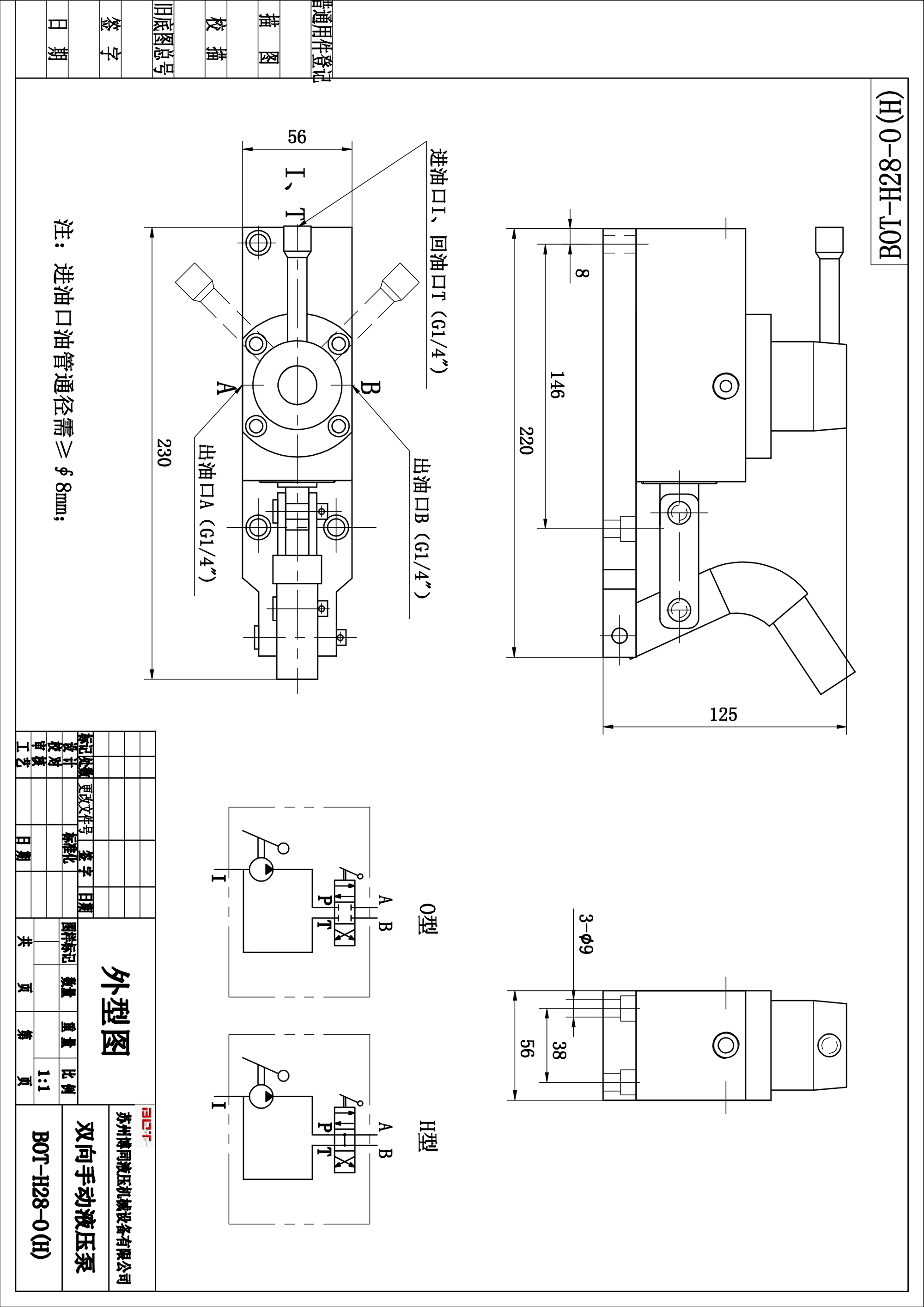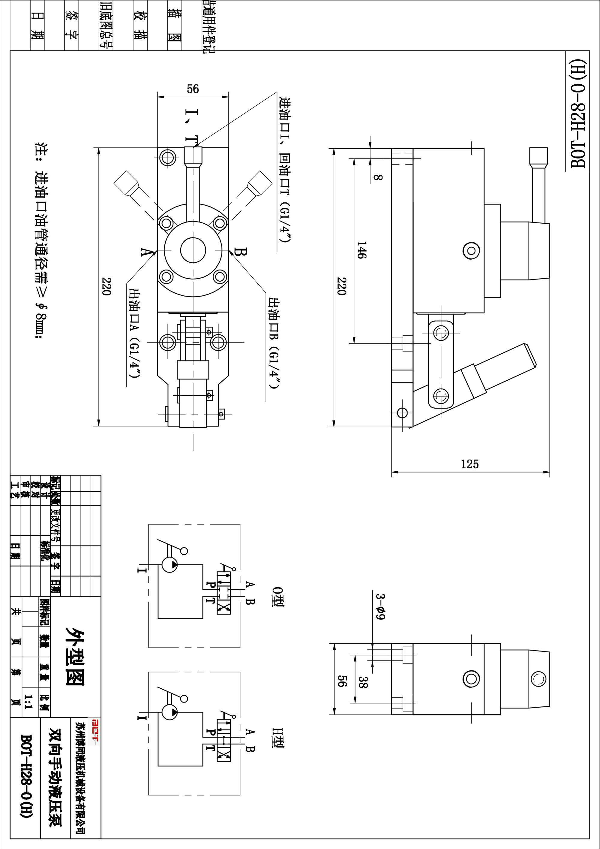本雙向手動液壓泵采用內排內泄結構。換向集成與泵體一體,通過換向手柄轉動,可分別選擇出油A口或B口方向出油打壓,通過進油口(回油口)吸油和回油,進出油接口分別是G1/4;